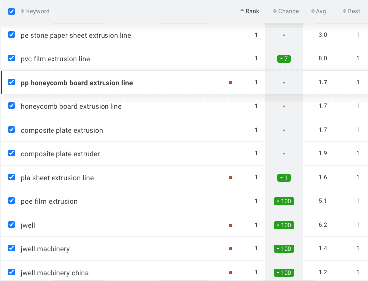 正是因?yàn)榭蛻?hù)選擇了適合自己產(chǎn)品的谷歌SEO推廣計(jì)劃,所以目前網(wǎng)站的關(guān)鍵詞『jwell machinery』『pvc film extrusion line』『jwell extrusion』及其相關(guān)的84個(gè)長(zhǎng)尾關(guān)鍵詞均長(zhǎng)期占據(jù)首頁(yè)首位。