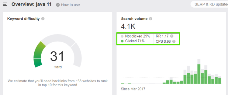 如果你想增加從直接答案中獲得有機流量的可能性,你需要在選擇關(guān)鍵詞的階段就已經(jīng)考慮好了。除了將單詞與您的業(yè)務(wù)和數(shù)量相匹配外,您還必須記住給定單詞的點擊率。它只是以點擊結(jié)束的所用單詞的展示次數(shù)的百分比。例如,“java 11”短語會在 29% 的搜索中產(chǎn)生點擊。相比之下,“java 11 features”短語的點擊率較低 (21%)。因此,最好在輸入“java 11”短語后顯示在直接答案中。